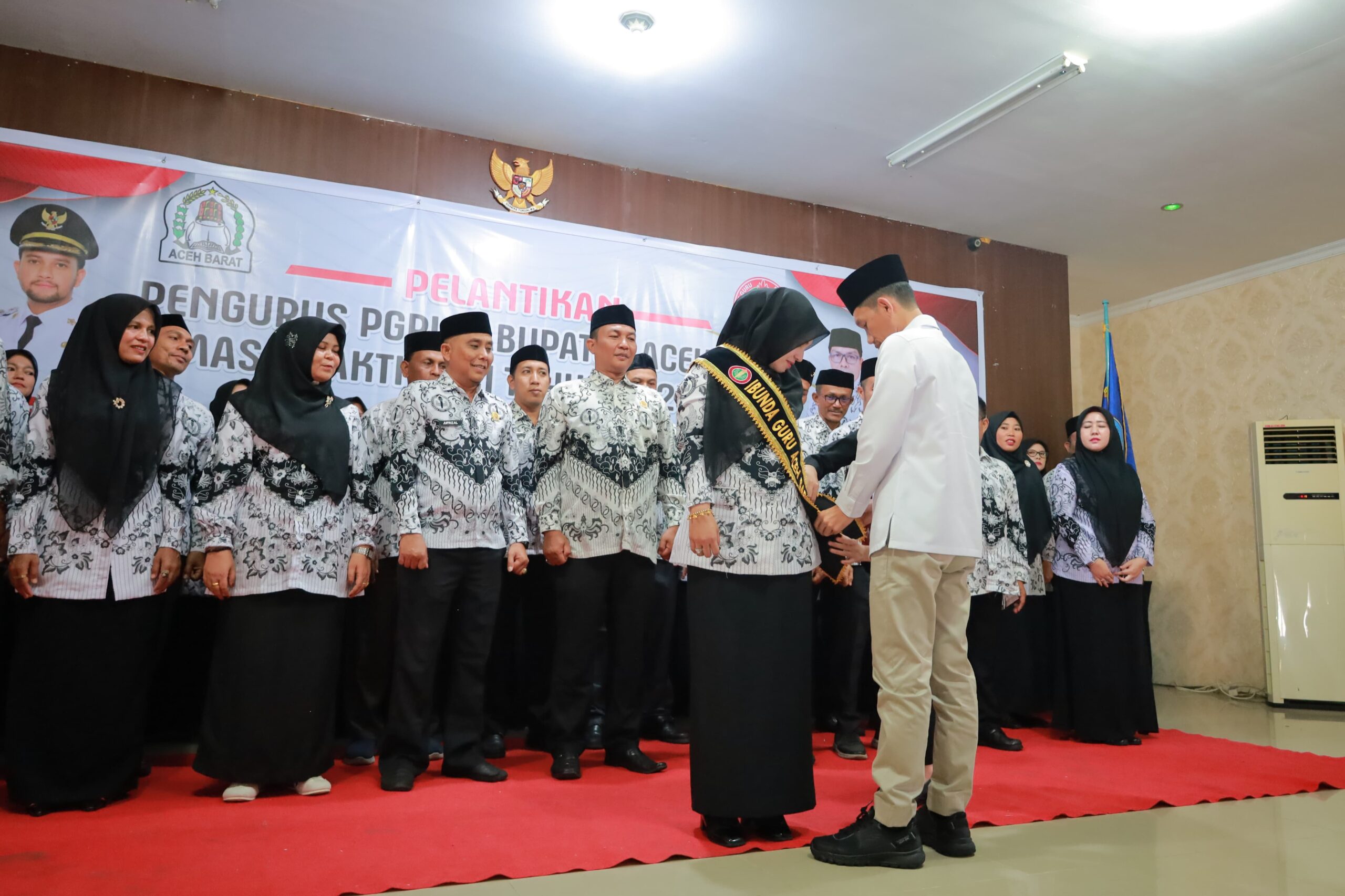 Meulaboh, Independen News – Bupati Aceh Barat, Tarmizi SP, MM menghadiri pelantikan pengurus Persatuan Guru Republik Indonesia (PGRI) Aceh Barat masa bakti XXIII Tahun 2025 – 2030, dan mengukuhkan Ny Afrinda Novalia sebagai Ibunda Guru Aceh Barat di Aula Gedung B Disdikbud setempat pada Sabtu (17/1/2026).