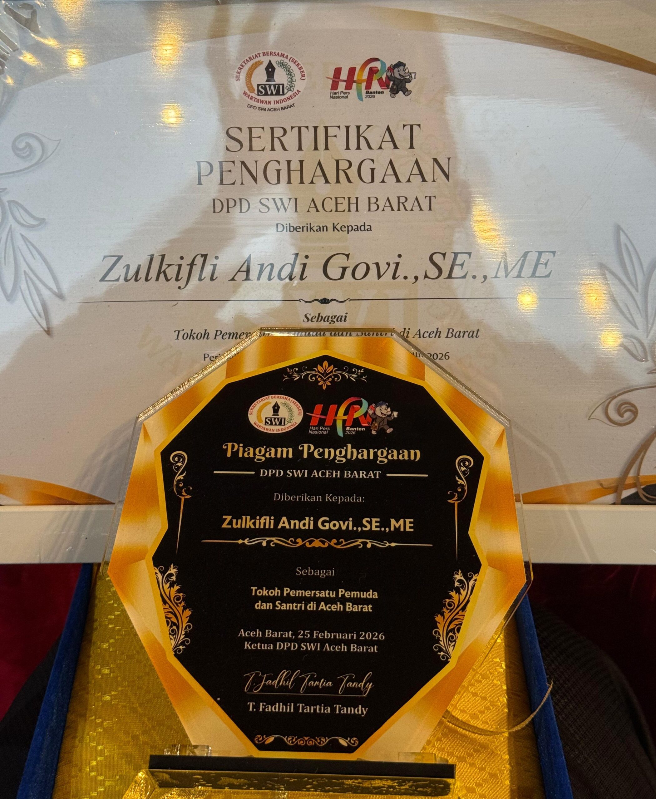 Meulaboh, Independen News – Dalam rangka memperingati Hari Pers Nasional (HPN) 2026, Dewan Pimpinan Daerah Sekber Wartawan Indonesia (DPD SWI) Aceh Barat memberikan piagam penghargaan kepada Zulkifli Andi Govi, SE., ME., atau yang akrab disapa Dek Zoel, sebagai Tokoh Pemersatu Pemuda dan Santri di Aceh Barat.
