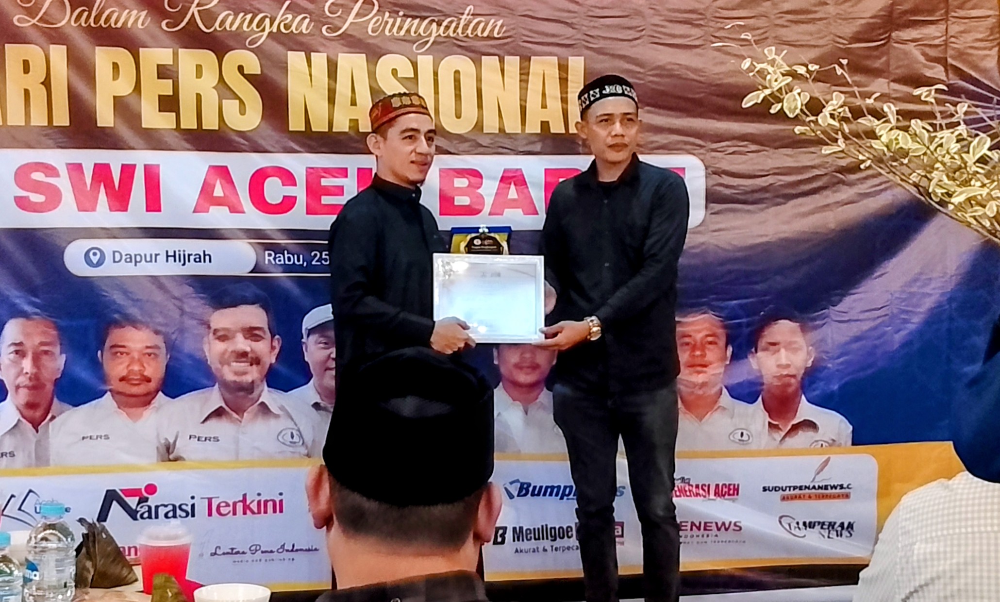 Penyerahan penghargaan berlangsung di Caffe Hijrah, Seunebok, Aceh Barat, pada Rabu (25/2/2026), bersamaan dengan kegiatan Doa dan Tausiah Akbar untuk korban banjir Aceh.