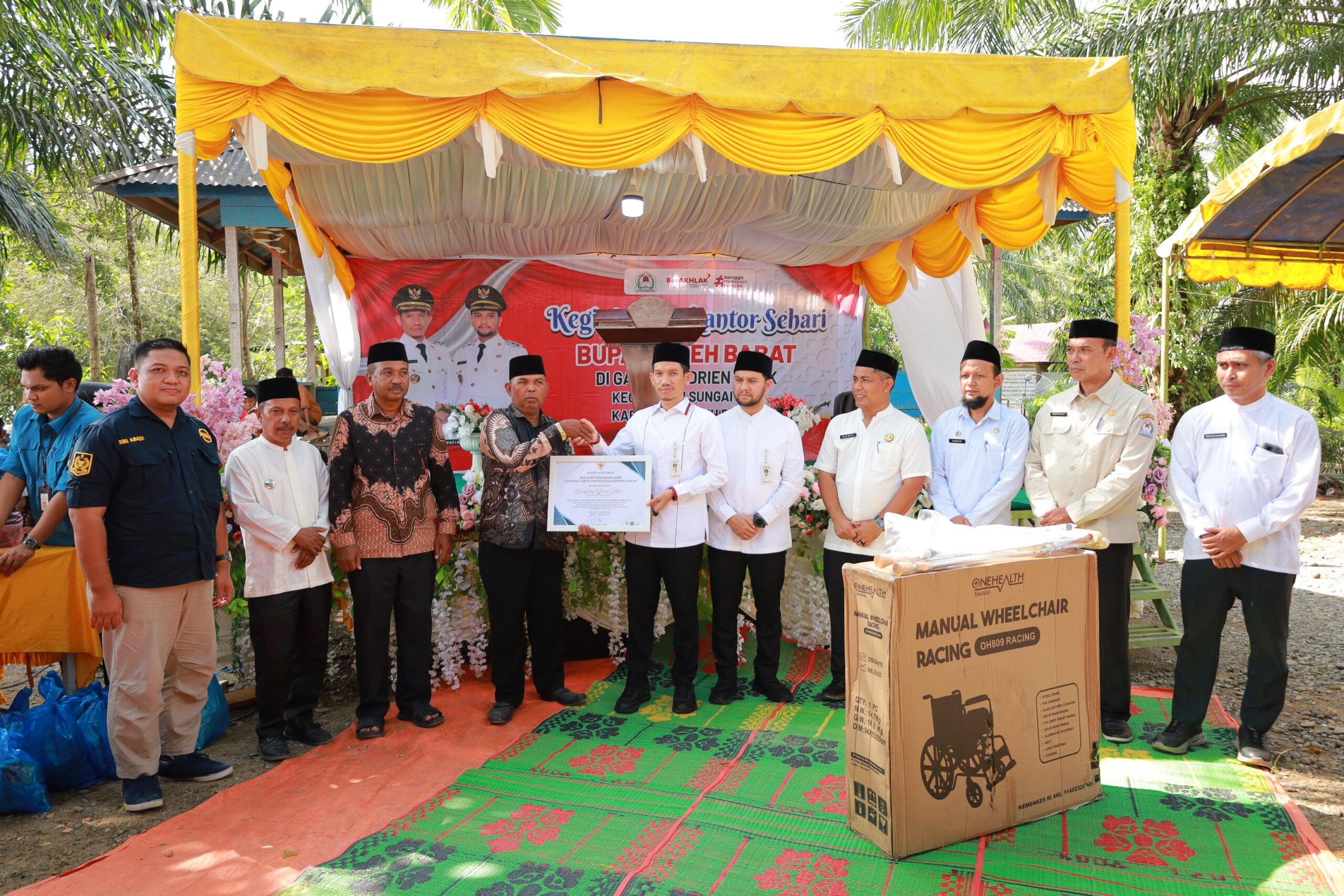Pada kesempatan tersebut, pemerintah daerah juga menyerahkan bantuan perlengkapan shalat untuk masjid setempat sebagai bentuk dukungan terhadap kegiatan keagamaan di desa.