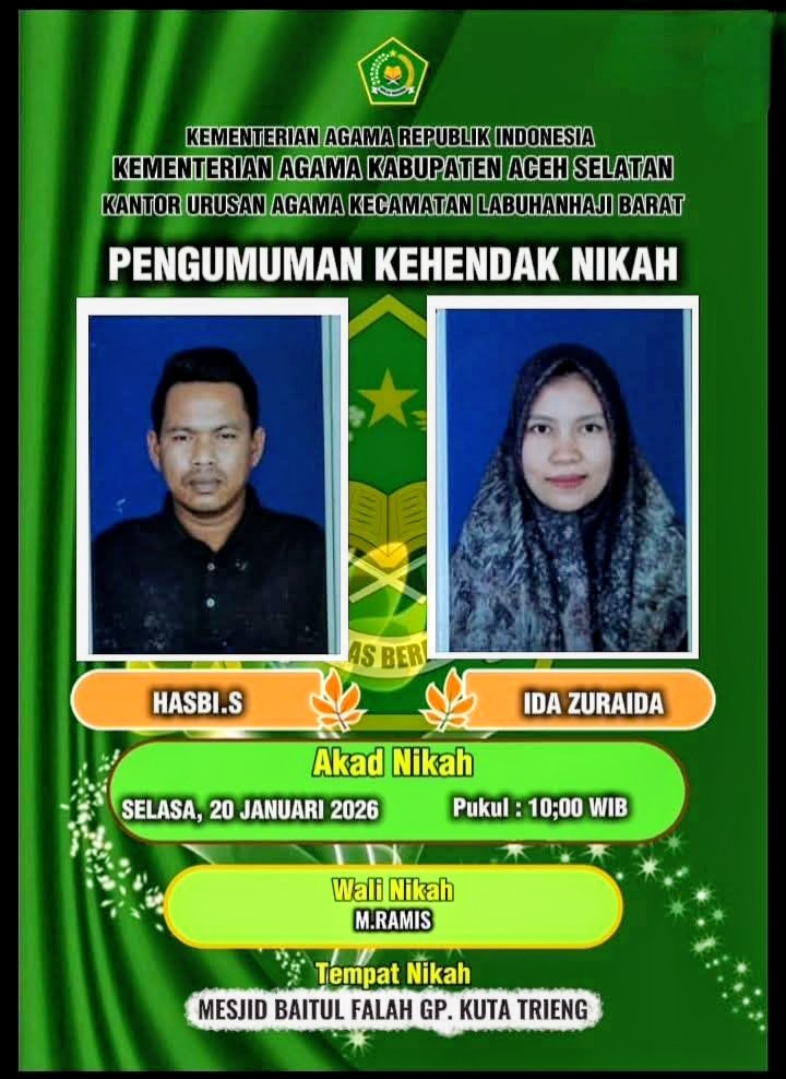 Aceh Selatan, Independen News – Publikasi Pengumuman Kehendak Nikah yang dilakukan oleh Kementerian Agama melalui Kantor Urusan Agama (KUA) Kecamatan Labuhanhaji Barat, dan ditayangkan melalui akun media sosial Facebook Penyuluh Labar, mendapat apresiasi dari berbagai kalangan. Langkah ini dinilai sebagai terobosan yang edukatif, transparan, dan strategis dalam mendukung tata kelola pelayanan keagamaan yang akuntabel.