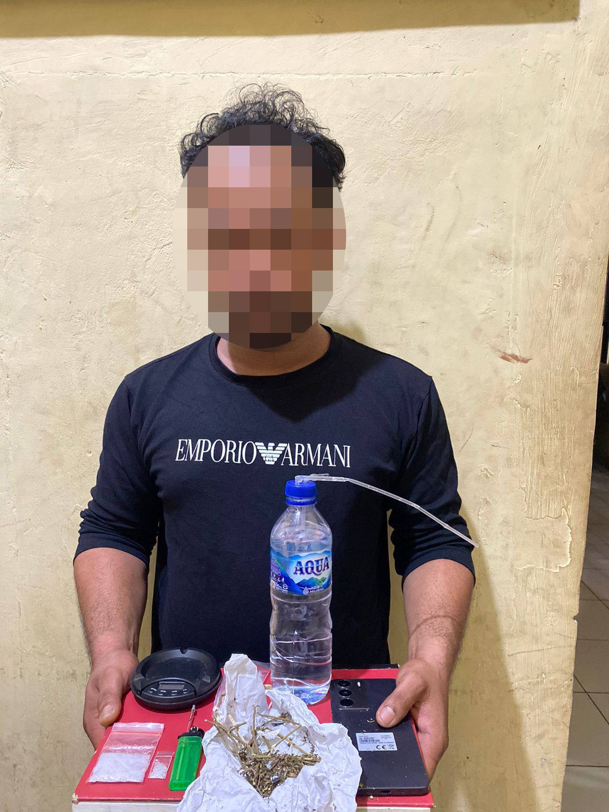 Selain itu, petugas juga mengamankan satu bungkus kertas berisi diduga ganja dengan berat bruto 6,97 gram, 50 plastik klip kosong, satu unit timbangan, satu buah bong, satu pirek (kaca), satu korek api, serta satu unit handphone merek Realme warna hitam. Barang bukti tersebut diakui sebagai milik tersangka.